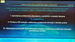 Na državnom stručnom skupu iz građanskog odgoja i obrazovanja “ Upravljanje problemnim situacijama u osnovnim i srednjim školama – participacija učenika u školi u rješavanju problemnih situacija“ dr. sc. Nevenka Modrić održala je (10. siječnja 2022.) webinar (4sata) za 352 učitelja i nastavnika osnovnih i srednjih škola iz svih predmetnih područja te za stručne suradnike.